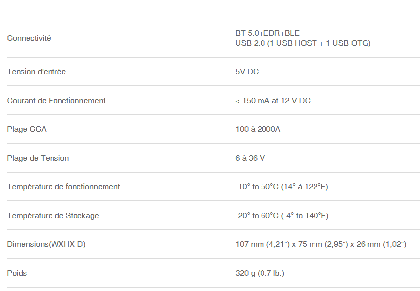 • Réduit les erreurs de diagnostic des batteries • Diagnostique les batteries de faible capacité • Réduit le temps de charge pour contrôler les batteries déchargées. |